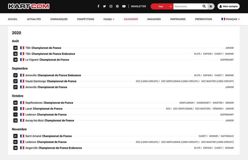 L'onglet "calendrier" de Kartcom permet quant à lui l’affichage chronologique des compétitions FFSA grâce à l’utilisation de ses filtres.