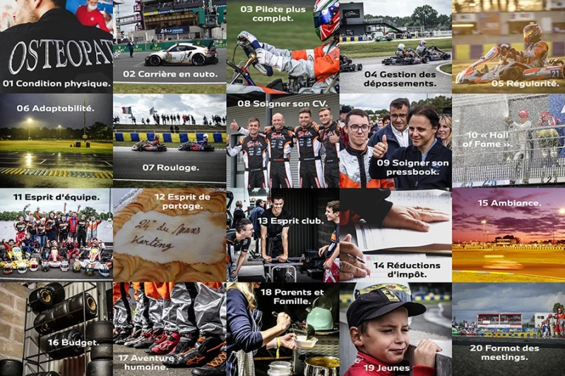 16. Budget pour les 24 Heures Karting au Mans : environ 15.000 € TTC (hors déplacements, hébergement, frais de communication, combinaisons pilotes, licences mécanos, ostéopathe, réceptif, déco stand pour les dépenses, hors revente matériel et partenariats / mécénats pour les recettes). Il est maintenant possible de le diviser par 5, nombre maximum de pilotes par équipage.