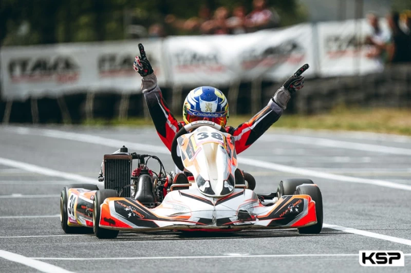 Broggio se faisait pressant sur Weisenburger sous le regard intéressé d’Iglesias, Naël Marin Dubuard (OTK) se rapprochait de la 4e position de Lacreuse. Dans le 9e des 21 tours, Iglesias passait à l’attaque sur Broggio pour la 2e place et Marin Dubuard dépassait Lacreuse pour la 4e. Weisenburger parvenait à conserver quelques dixièmes d’avance sur Iglesias qui devait gérer Broggio dans ses roues. Mais le neveu du Champion du Monde KZ se rapprochait à partir du 14e tour. La distance entre les deux pouvait ensuite se mesurer en centimètres et Iglesias finissait par trouver l’ouverture au 18e passage. Broggio suivait le mouvement au 19e tour. Iglesias s’imposait tandis que Weisenburger trouvait la ressource pour réagir et terminer 2e face à Broggio. Marin Dubuard était revenu à 0,139’’ de la 3e place sans avoir le temps d’en profiter. Lacreuse terminait isolé en 5e position, comme Blin 6e. Lorenzo Suau (Tony Kart) résistait en 7e position au retour de Théodore Primault (Redspeed) , Arthur Marcou (Redspeed) et Edouardt Giurca (Kosmic).