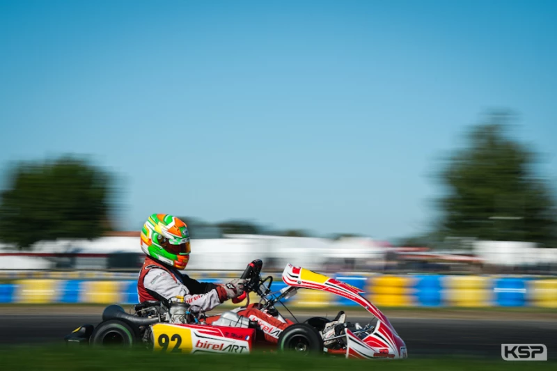 Enzo Valente (Sodi/TM) et Nicolas Masle (Birel ART/TM) prenaient l’avantage au départ sur Maxime Grillon (Birel ART/TM). Matt Preuvost (Sodi/TM) était 4e devant Nathan Hédouin (Birel ART/Vortex). Masle prenait les commandes au 2e passage devant Grillon et Valente qui e tardait pas à revenir 2e. Gabin Leuillet (Birel ART/TM) faisait son entrée dans le top 5 (+5 places) et dépassait Preuvost au 5e passage pour prendre la P4. En tête, Masle et Valente étaient au coude-à-coude. Grillon et Leuillet réalisaient le meilleur tour à égalité parfaite au 8e passage. Antoine Broggio (Birel ART/TM) dépassait Hédouin pour la 6e position. Grillon attaquait Valente dans le 12e tour pour passer 2e, 0,669’’ derrière le leader. Masle l’emportait moins de 5 dixièmes devant Grillon, Valente terminait 3e devant Leuillet et Broggio. Rapide en fin de course, Yohan Soguel (Oberon/TM) était 6e devant Preuvost et Hédouin. Arthur Lehouck (CRG/TM) réalisait le meilleur tour et gagnait 13 places au 9e rang. 11e, Romain Couedic (CRG/TM) avait repris 10 places.