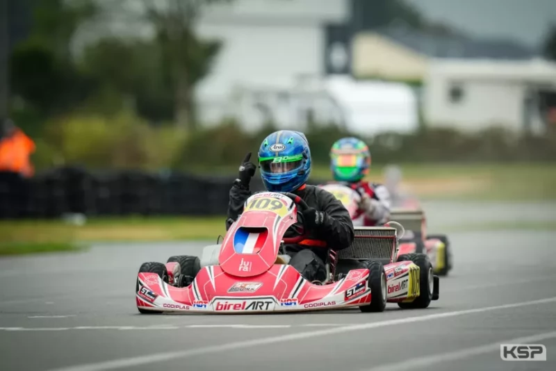La pluie avait cessé, mais la piste restait mouillée pour la finale du Championnat de France KZ2 Master à Laval. Nelson Bondier (Birel ART/TM) menait déjà avec une avance de près d’une seconde après le 1er tour devant Sylvain Valet (Sodi/TM), Paul David (Birel ART/TM) et Charles Fiault (Sodi/TM) 4e. Valet rétrogradait 4e, David se retrouvait second à 1,8’’ de Bondier et 1,3’’ devant Fiault au 3e tour. David Léglise (Birel ART/TM) avait repris 8 places pour rentrer dans le top 5 devant François-Xavier Brou (Birel ART/TM). Les trois premiers tournaient en 55’’5 contre plus de 56’’ à leurs poursuivants. Au 8e passage, David claquait un 55’’190, 3 dixièmes plus vite que Bondier et entamait un rapprochement rapide avec le leader. Au 12e des 19 tours son retard était passé de 2’’ à 1,3’’, mais Bondier réagissait. David se remettait à la chasse et revenait à 0,685’’ au 15e passage grâce à un tour en 55’’023. L’écart n’était plus de 2 dixièmes au tour suivant. Bondier semblait contrôler la situation dans l’avant-dernier tour et remprtait la victoire pour 3 dixièmes. Fiault finissait 3e à plus de 3 secondes, Valet était 4e à 10’’ et Léglise 5e à 4 dixièmes.