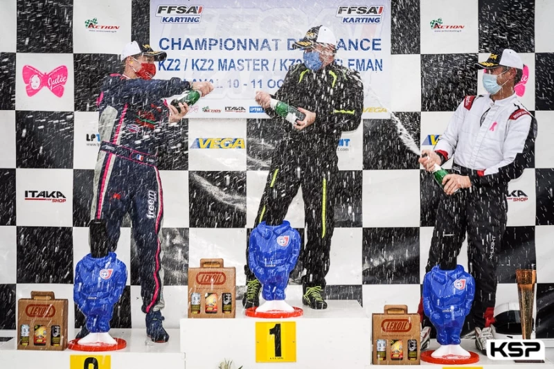 Yoann Sanchez s’est battu pendant tout le week-end face à des adversaires sérieux pour remporter finalement la couronne en KZ2 Master. Antoine Poulain a été son rival le plus proche, puisqu’il a même remporté la finale 3. Constamment dans le top 3 en début de meeting, le champion sortant Charles Fiault essayait toujours de faire progresser son châssis lors des finales. Il faisait malgré tout bonne figure sur la 3e marche du podium. Moins à son aise dans les manches, Sylvain Vallet remontait jusqu’à la 8e position du championnat dans les phases finales avec un gain de 10 places. Julien Guéant faisait partie des pilotes capables de finir aux portes du top 3, mais la dernière finale l’a relégué en 9e position. Victime d’un abandon en finale 1, Julien Jehanne pouvait difficilement faire mieux que sa 19e position.