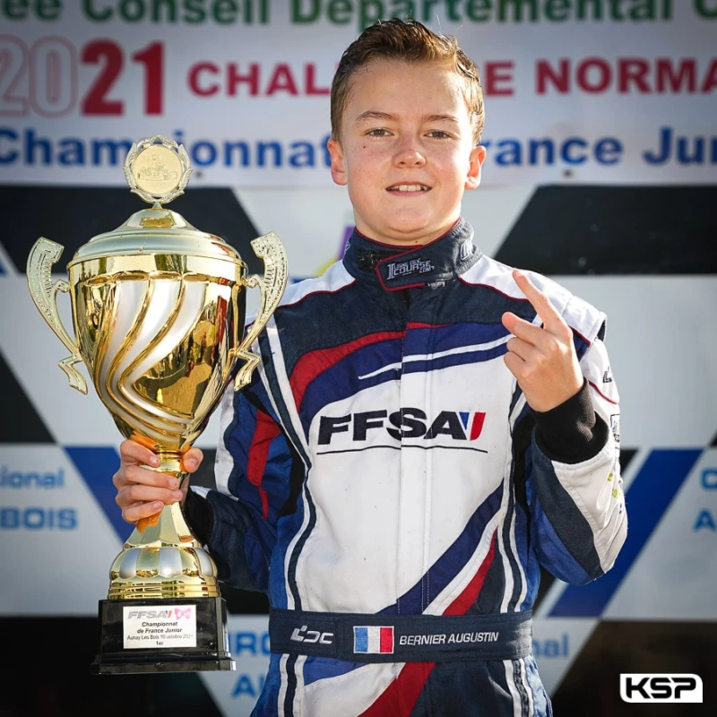 Le nouveau Champion de France Junior Augustin Bernier a été devancé à plusieurs reprises lors de la dernière épreuve du Championnat de France Junior Karting opéré par la FFSA Academy sur le circuit international d’Aunay-les-Bois ce week-end des 9 et 10 octobre 2021. Mais Bernier a malgré tout pu saluer son titre par une double victoire lors des phases finales. Les autres héros du meeting ont été Corentin Rousseau, le poleman des chronos, Hugo Herrouin, vainqueur de la 2e manche et Paul Alberto le vice-Champion qui a pointé un court instant en tête de la finale.
